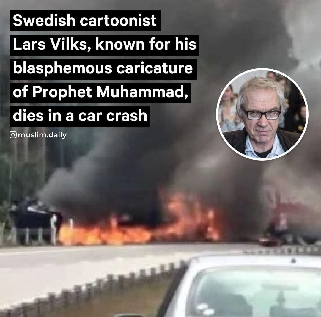 Lars Vilks a Swedish Mohammad cartoonist was killed in a car accident. The Swedish artist Lars Vilks who has lived under police protection since his 2007 sketch caricaturing the prophet Muhammad brought. According to reports Lars Vilk was the main target of the Islamist terrorists for a long time and was continuously hounded by the Muslim protesters.